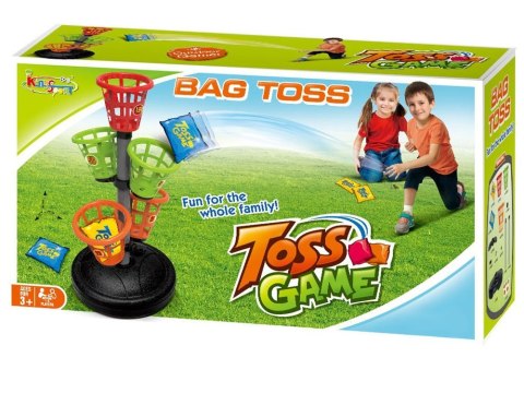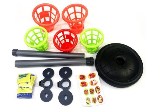 W zestawie: - podstawa, rurki i uchwyty potrzebne do złożenia stelażu zabawki, - 5 koszyków w różnych kolorach i rozmiarach - 6 woreczków typu "zośka". - naklejki z punktacją.
