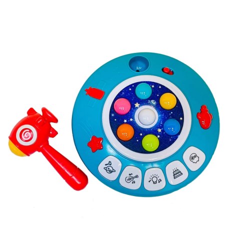 Zabawa rozpoczyna się po przełączeniu guzika ON/OFF. Zadaniem dziecka jest trafianie młoteczkiem w przyciski, które podświetlają się w różnej kolejności. Każde poprawne trafienie to kolejny krok w kierunku sukcesu! Dzięki dwustopniowej regulacji głośności, zabawka jest przyjazna nie tylko dla dzieci, ale również dla rodziców.