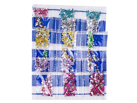 Okrągłe i posegregowane diamenciki w różnych kolorach,