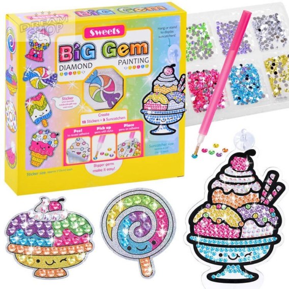 Haft diamentowy zestaw kreatywny SŁODYCZE to najmodniejsza kreatywna zabawa dla dzieci tego sezonu. Zestaw pozwala na stworzenie pięknych wzorów z bajecznie kolorowych diamencików. Zabawa polega na dobraniu odpowiednich kolorów diamencików i przeniesienie ich na szablon z klejem za pomocą specjalnego długopisu. Po ułożeniu elementów uzyskujemy piękną kolorową ozdobę. Za pomocą dołączonych do zestawu: plastikowych podstawek oraz silikonowych przyssawek z haczykami wykonane prace można postawić np. na biurku, na półce, zawiesić na szybie, lustrze lub ozdobić nimi ulubiony zeszyt, teczkę lub pamiętnik. Układanie maleńkich elementów jest bardzo wciągające, przy okazji ćwiczy koordynację ręka-oko, uczy cierpliwości, pobudza kreatywność dziecka.