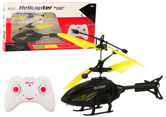 Lekki, mały helikopter zdalnie sterowany w kolorze czarnym z żółtymi elementami. Sterowany pilotem lub ręką, zapewnia więcej zabawy. Wyposażony w żyroskop, który stabilizuje lot, ułatwiając kontrolę. Idealny dla dzieci i dorosłych,