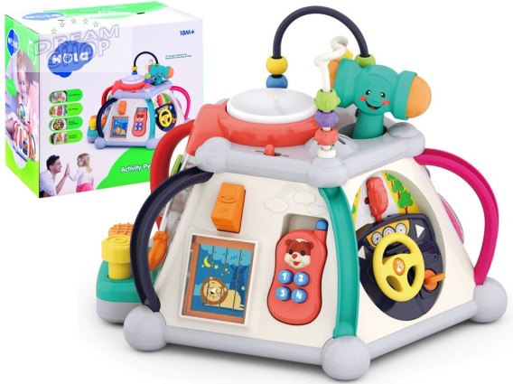 Zabawka posiada pięć interaktywnych płaszczyzn i jedną górną, a także labirynt kolorowych koralików do ćwiczenia zdolności manualnych. Każda ściana zabawki posiada inny zestaw zabawowo - edukacyjny. Jest wykonana bardzo solidnie i efektownie w bardzo ładnych współgrających kolorach.