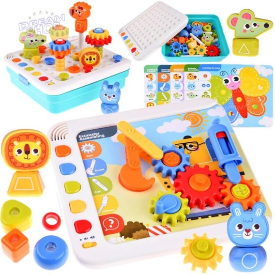 - kolorowe klocki, zębatki, figurki zwierząt: żyrafa, królik, myszka, lew