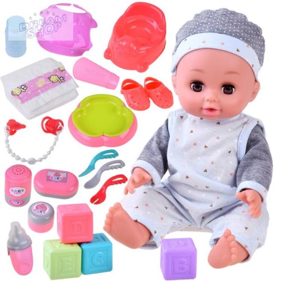 Urocza lalka niemowlę ze smoczkiem na łańcuszku ubrana w pajacyka i czapeczkę. Lala wyglądem przypomina noworodka, a takim uroczym bobasem zaopiekuje się każda mała opiekunka, będzie mogła ją karmić, tulić, śpiewać piosenki i chodzić na spacery. Lalka ma uroczą buzię i brązowe oczka, które zamykają się, dzięki czemu może również spać. Tułów lalki wykonany jest z plastiku, posiada tylko gumową głowę, ręce i nóżki. Wszystko jest ruchome, dzięki czemu będzie mogła przyjmować przeróżne pozycje podczas leżakowania. Niczym prawdziwy niemowlak nie ma włosków na głowie, do ubranka przypięty jest smoczek na łańcuszku, tak aby się nie zawieruszył. Lalka posiada także funkcję pojenia, dzięki czemu może także sikać. Podczas karmienia można założyć śliniaczek. W wyposażeniu znajduje się także m.in.: pampers i nocnik dla laleczki, na którym można ją posadzić po jedzonku. Interaktywna lalka z zamykanymi oczkami, odgłosami maluszka, sikająca to jest to, czego małe opiekunki, mamusie potrzebują. Dzięki akcesoriom zawartym w zestawie dziecko może otoczyć lalkę maluszka czułością i opieką.