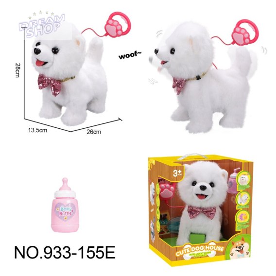 Interaktywny, sensoryczny biały piesek dla dzieci od trzeciego roku życia. Piesek wykonany został z miękkiego bezpiecznego dla dziecimateriału, będzie idealny do głaskania i przytulania. Zabawka do złudzenia przypomina prawdziwe zwierzątko i posiada interaktywne funkcje. Dotknij głowy pieska, a zwierzątko zacznie wchodzić z tobą w interakcje. Będzie kiwać głową, merdać ogonkiem, wydawać szczekający dźwięk, lizać języczkiem i chodzić. Piesek posiada interaktywną smycz. Krótkie naciśnięcie uchwytu smyczy powoduje, że pies może szczekać, wysuwać język, merdać ogonem i chodzić w rytm muzyki. Naciśnięcie i przytrzymanie uchwytu powoduje uruchomienie funkcji nagrywania i odtwarzania, piesek będzie powtarzał po Tobie. W zestawie z pieskiem znajduje się butelka.Zabawka zasilana jest bateriami typu 3 x AA 1,5V (brak w zestawie).
