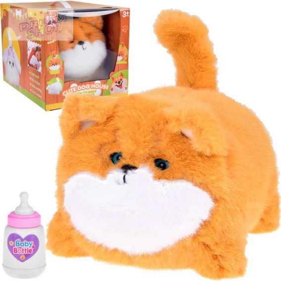 Szczekający piesek, pluszowa zabawka, mięciutki pies, milutki w dotyku, piesek, psi przyjaciel stworzony na wzór Shiba Inu i Akita Inu, rudy kolor zwierzaka, zwierzak domowy w zestawie z butelką
