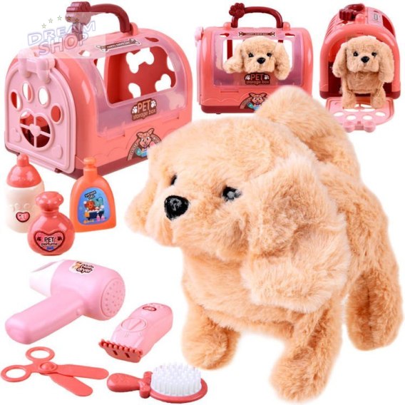 Salon spa + piesek. Pluszowy szczeniak, szczeka, chodzi, merda ognikiem, transporter, akcesoria do pielęgnacji