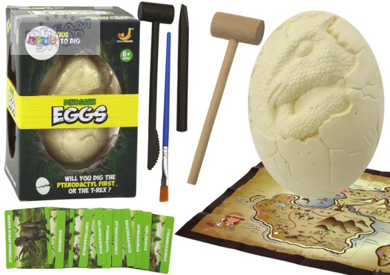 W zestawie znajduje się drewniany młoteczek, dwa pędzelki i dłuta, które stanowią narzędzia niezbędne do rozpoczęcia ekscytującej przygody. Zadaniem dziecka jest wykopać ze skamieniałej skorupy jajo 12 figurek dinozaurów, które kryją się w jej wnętrzu. To zadanie nie tylko rozwija wyobraźnię i motorykę dziecka, ale także pozwala mu poczuć się jak prawdziwy paleontolog.