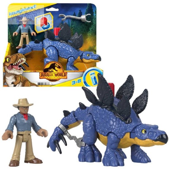 Zestaw figurek Imaginext od Fisher-Price z serii JurassicWorld zawierający dinozaura Stegozaura oraz Doktora Granta dla najmłodszych miłośników prehistorycznych gadów. Figurka przedstawia odważnego Doktora Granta oraz złapanego przez niego Stegozaura. Dinozaur na grzbiecie posiada czerwone pokrętło mocy, dzięki któremu może wyrwać się z założonej uprzęży. Przekręcając pokrętło, powodujemy, że dinozaur porusza ogonem w górę i w dół. Figurki posiadają ruchome kończyny. Zostały wykonane z wysokiej jakości plastiku, dodatkowo dinozaur posiada gumowe elementy. Zestaw to świetny pomysł na prezent dla fanów Jurassic World w wieku od 3 do 8 lat, zwłaszcza tych którzy uwielbiają filmy Jurassic World, dinozaury i odgrywanie ulubionych scen z filmu lub bajek.