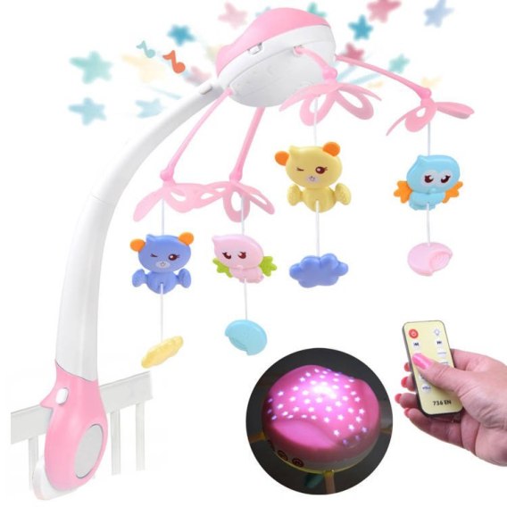 Zabawka posiada pilot, dzięki któremu rodzic może włączyć karuzelkę z drugiego pokoju.
