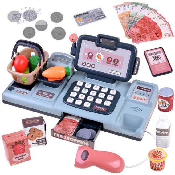 W wyposażeniu kasy jest ekran LCD, na którym pojawiają się cyfry. Przyciski w kasie i czytnik produktów spożywczych z dźwiękiem, pozwala na profesjonalną obsługę klienta. Czytnik tak jak to w prawdziwym sklepie skanuje towar. Wystarczy przyłożyć produkt do skanera i przycisnąć guzik znajdujący się na skanerze. Usłyszymy też dźwięk skanowanego produktu. Kwota za zeskanowany artykuł pojawi się na wyświetlaczu - wystarczy wcisnąć przycisk (+), a będziesz mógł dalej czytać pozostałe przedmioty.