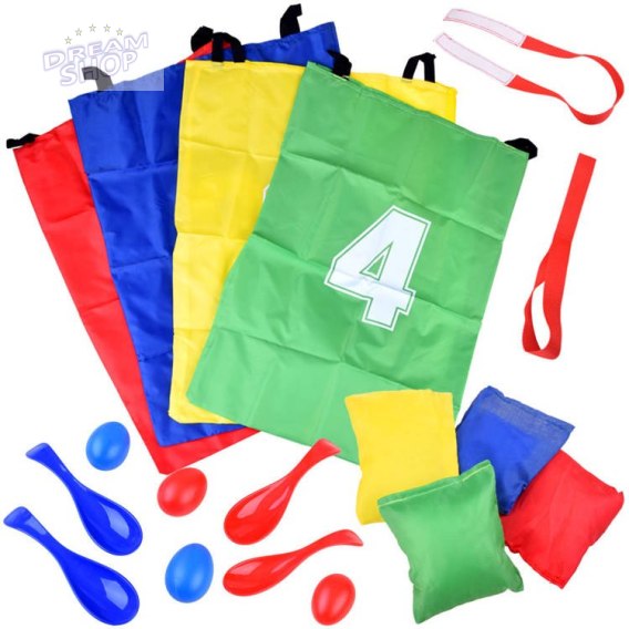 Zestaw Kinderparty do zabaw ogrodowych. Worki do skakania, łyżeczki z jajkiem, rzepy, woreczki Zośka