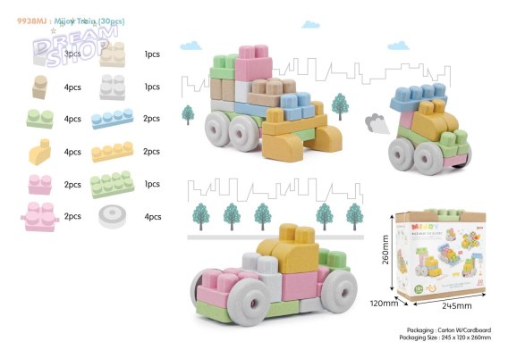 Zestaw klocuszków konstrukcyjnych dla maluszków od 18-go miesiąca życia z serii ekologicznej, przyjaznej dla środowiska. Zaprojektowane w celu zachęcenia świata do używania mniejszej ilości plastiku. Wykonane zostały w 25 % z biotworzywa stanowiącego odpady łusek i łupin ryżowych. Klocuszki posiadają zaokrąglone krawędzie, mają różne kształty i piękne pastelowe kolory. Zestaw składa się z 30 elementów z których złożyć można różne konstrukcje. Układanie klocków pozytywnie wpływa na rozwój dziecka, rozwija umiejętności przestrzenne i motoryczne, uczy kreatywności.