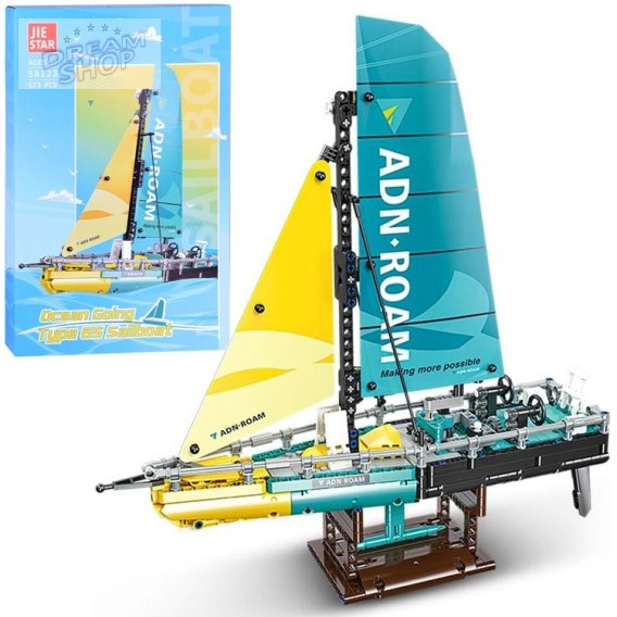 Klocki techniczne Jacht regatowy 675 elementów. Pozwól swojemu dziecku zanurzyć się w świat sportów wodnych wraz z rewelacyjnym jachtem. Ta łódź ma sportową żółto-niebieską kolorystykę z naklejkami z wyścigów morskich, kolorowe żagle z linami i kabestanami oraz szczegółowy kadłub. Steruj łodzią, obracając kierownicę lub poruszając rumplem, obsługuj wyciągarkę i wyreguluj żagle.