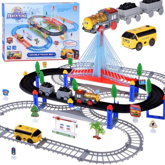 Elektryczna kolejka z mostem wiszącym, autobusem i efektami świetlno-dźwiękowymi.