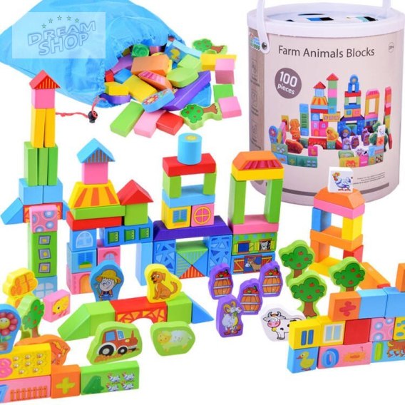 Zestaw kolorowych klocków drewnianych w efektownych wzorach i kolorach przeznaczony jest dla każdego dziecka lubiącego tworzyć samodzielnie własne budowy. Z zestawu można zbudować budynki, farmę wyposażyć w zwierzątka, drzewa, kwiaty. Bardzo ładna kolorystyka i grafika zestawu zapewni piękne budowle. Drewniane klocki będą służyły długo i zapewnią dziecku wiele lat ciekawej i kreatywnej zabawy. Drewno jest ciepłe i przyjemne w dotyku. W dodatku to surowiec naturalny i w pełni ekologiczny. Zestaw składa się ze 100 elementów, zapakowanych w niebieski woreczek, a schowanych w tekturowym wiaderku z uchwytem.