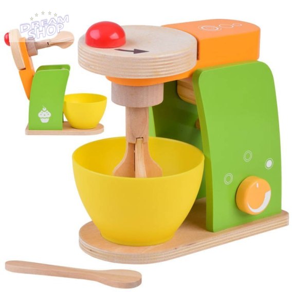- Drewniany mikser kuchenny z ruchomą łopatką - idealny do "miksowania" składników. - Drewnianą łyżkę do mieszania - niezastąpiona pomoc w przygotowywaniu wyimaginowanych potraw. - Plastikową miseczkę - lekka i bezpieczna, idealna do mieszania składników.