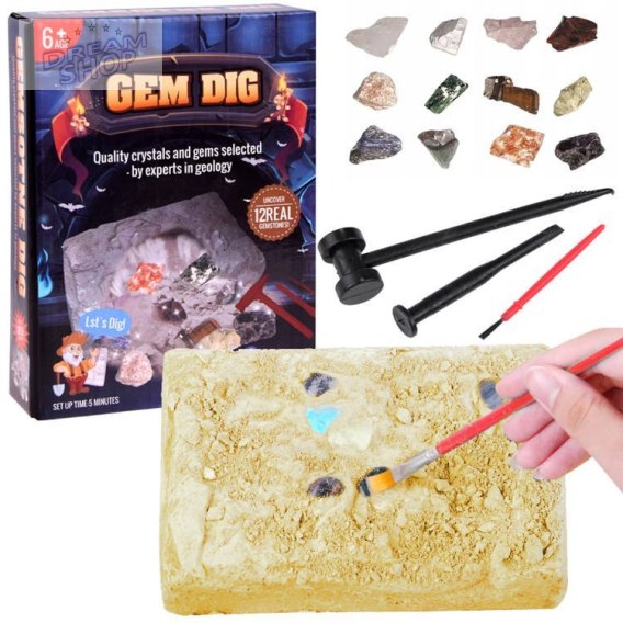 Edukacyjny zestaw dla małego archeologa, poszukiwacza skarbów. Zestaw wykopaliska z kamieniami świetnie się sprawdzi dla każdego małego poszukiwacza, odkrywcy wykopalisk. Zabawka do samodzielnego wykonania, będąca symulacją wykopalisk archeologicznych w nowej, unikalnej oraz atrakcyjnej formie. Zadaniem odkrywcy jest wydobycie za pomocą młoteczka, dłutka, pędzelka ukrytych w odlewie gipsowym szlachetnych kamieni.