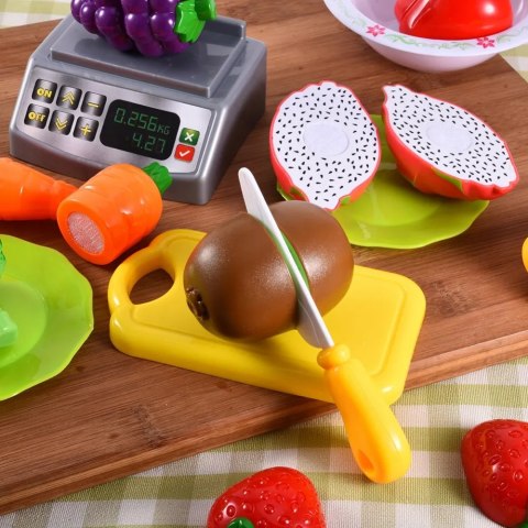 Warzywa i owoce można przekroić nożykiem, który jest w zestawie. Dzięki rzepom owoce i warzywa można ponownie łączyć. Śliczne kolory oraz poziom odwzorowania prawdziwych produktów sprawi, że to będzie świetna zabawa. Koszyczek można wziąć do rączki i przenosić w nim wszystkie produkty.