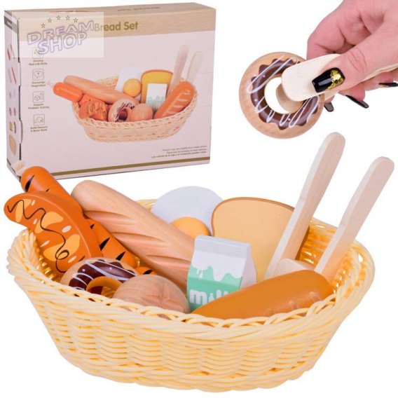 Drewniany zestaw śniadaniowy, chleb, drewniane jedzenie, pieczywo z koszykiem - edukacyjna zabawa w gotowanie!