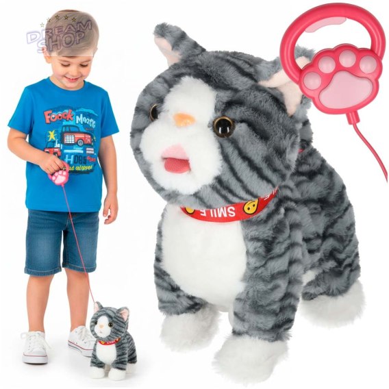 Kotek interaktywny na smyczy miauczy chodzi rusza ogonem szary