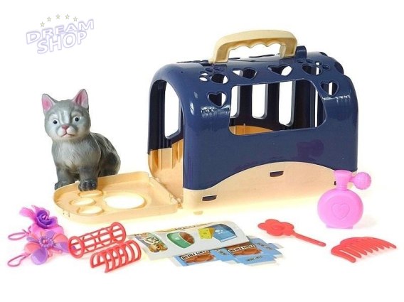 Kotek z klatką do przenoszenia z akcesoriami