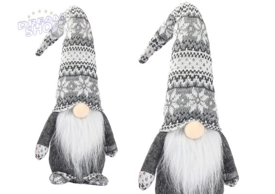 Siwy krasnal świąteczny z siwo-białą czapką, którą można dowolnie formować dzięki drucikowi. Stabilnie stoi dzięki zrównoważonemu obciążeniu. Wykonany z miękkiego, przyjemnego w dotyku materiału. Wymiary 40cm x 16cm.