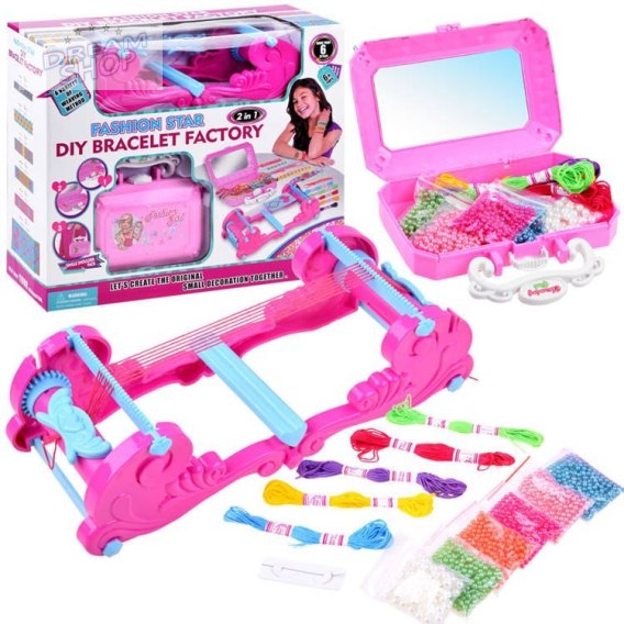 Krosno do tworzenia bransoletek + plastikowy kuferek/torebka to propozycja dla każdej małej zdolnej strojnisi, która lubi prace plastyczne, zręcznościowe. Samodzielnie stworzona biżuteria w postaci bransoletki, korali będzie zawsze najpiękniejsza i najcenniejsza. Zestaw oprócz maszynki/krosna do tkania bransoletek zawiera też kolorową mulinę, perłowe koraliki, sznur pereł, które mogą służyć jako pasek do torebki, ale też jako ozdoba ubrania się sprawdzą. Kreatywny zestaw pozwoli każdej dziewczynce stworzyć samodzielnie bransoletki z błyszczącymi koralikami, które mogą być wspaniałym prezentem dla mamy, siostry, przyjaciółki.