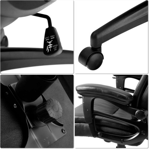 Fotel CONCORD wykonany jest z wysokiej jakości ekoskóry w kolorze czarnym, co nadaje mu elegancki i profesjonalny wygląd. Czarna kolorystyka elementów z tworzywa dodatkowo podkreśla jego nowoczesny design.