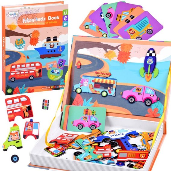 Magnetyczne pojazdy to układanka składająca się z 66 elementów, pozwoli dziecku stworzyć samodzielnie wybrane pojazdy z kart, lub tez zaprojektować własny unikatowy pojazd. Wiadomo wyobraźnia dzieci jest olbrzymia! Zestaw został zamknięty w twarde, tekturowe opakowanie imitujące książkę. Wewnątrz znajduje się powierzchnia z drogą na której należy układać pojazdy. Z zestawu można ułożyć: