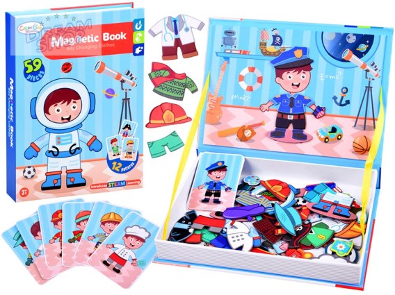 Pudełko zawody męskie to zestaw 59 magnetycznych ubrań oraz akcesoriów do ubrania modela, z którego można stworzyć piłkarza, ogrodnika, budowlańca itp. Fantastyczny kreatywny zestaw zamknięty w twardym, tekturowym pudełku imitującym książkę. Zestaw zawody pozwala dziecku samodzielnie decydować o ubraniu modela, ale także może skorzystać z podpowiedzi kart, na których są chłopcy w dostosowanych strojach do danego zawodu.