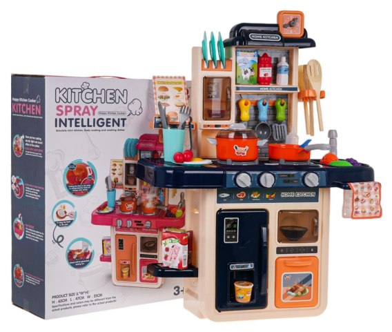 Multifunkcyjna kuchnia z funkcją światła, dźwięku, wody i pary dla dzieci powyżej 3-go roku życia. Kuchnia wykonana została z najlepszej jakości plastiku w żywych kolorach. Zestaw składa się z 42 elementów, jest bogato wyposażony w akcesoria kuchenne i atrapy produktów spożywczych. Kuchnia posiada działający kran, z którego leci woda, podświetlane palniki wydają odgłosy smażenia i gotowania, są też odgłosy wypadających kostek lodu, z palnika unosi się para wodna. Na wyposażeniu kuchni jest też lodówka, piekarnik i mikrofalówka. Szafki i półki pomieszczą wszystkie akcesoria. Zabawka zasilana jest bateriami typu 3 x AA 1,5 V (brak w zestawie).