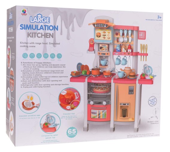 Interaktywna kuchnia z funkcją światła, dźwięku i kranikiem, z którego wydobywa się woda, a także mnóstwem akcesoriów, dla dzieci od 3-go roku życia. Kuchnia została znakomicie wykonana, z najlepszej jakości plastiku i jest w żywych kolorach zachęcających dziecko do zabawy. Na blacie kuchni znajduje się interaktywna płyta z palnikami. Po przekręceniu jednego z pokręteł słychać odgłosy gotowania, a drugiego, odgłosy smażenia. Odgłosom gotowania i smażenia towarzyszy podświetlenie palników. Z kranu faktycznie wypływa woda, jak w prawdziwym zlewie, dziecko będzie mogło umyć zabawkowe naczynia. W zestawie mamy też atrapę lodówki z otwieranymi drzwiczkami i dystrybutorem wody, otwierany piekarnik z efektami dźwiękowymi i świetlnymi, zmywarkę, ekspres do kawy, panel z wentylatorem oraz efektami dźwiękowymi i świetlnymi, telefonik z dźwiękiem i światłem oraz mnóstwo półeczek, na których ułożyć możemy atrapy produktów. Cały zestaw prezentuje się znakomicie. Zabawka zasilana jest bateriami typu 6 x AA 1,5 V (brak w zestawie) oraz 2 x AAA 1,5 V (brak w zestawie).