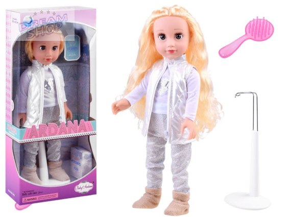 Specyfikacja - wzrost ok. 45 cm Zestaw zawiera: - lalka - stojak - szczotka do włosów