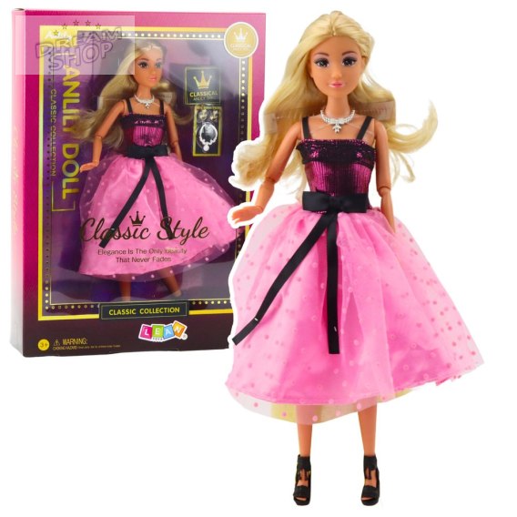 Elegancka lalka Anlily to wspaniała propozycja dla każdej dziewczynki, która marzy o zabawie w stylowe bale i przyjęcia. Lalka ubrana jest w efektowną różowo-czarną suknię balową, uzupełnioną o srebrny naszyjnik i czarne buty, idealnie pasujące do kolorystyki kreacji. Długie blond włosy pozwalają na tworzenie różnych fryzur, co daje dziecku jeszcze więcej możliwości zabawy.
