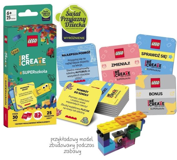"Uwielbiasz świat LEGO(R) i nie boisz się wyzwań? Ten zestaw jest właśnie dla ciebie! Losuj karty, dobieraj klocki i twórz niepowtarzalne modele związane ze szkołą. Daj się ponieść swojej kreatywności! Plecak na nowy rok szkolny albo piórnik, klasowy zwierzak, a może nauczyciel kieszonkowy? To tylko niektóre z konstrukcyjnych zadań, jakie cię czekają w tej rozgrywce. Uwaga! Właśnie wkraczasz do świata nieskończonych możliwości budowania i przebudowywania! W zestawie znajdziesz 4 typy kart: karty TWÓRZ! inspirują do budowania, karty SPRAWDŹ SIĘ! wprowadzają kolejne konstrukcyjne wyzwania, karty ZMIENIAJ! dodają kontekst i zachęcają do przebudowywania, a karta BONUS nada zupełnie nowy wymiar zabawie! Karty Wyzwań świetnie się sprawdzą w podróży. Można się nimi bawić samemu lub z przyjaciółmi. Zestaw zawiera: 32 karty 25 klocków LEGO(R) W serii LEGO(R) Recreate. Karty Wyzwań znajdziemy także inne tytuły: Zwierzęta, Kosmos, Zamek, Przygody ninja, Przygoda w mieście, Ocean, Wynalazki, Pupile, Urodziny, Natura."