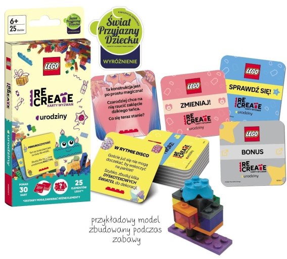 "Uwielbiasz świat LEGO(R) i nie boisz się wyzwań? Ten zestaw jest właśnie dla ciebie! Losuj karty, dobieraj klocki i twórz niepowtarzalne modele związane ze szkołą. Daj się ponieść swojej kreatywności! Plecak na nowy rok szkolny albo piórnik, klasowy zwierzak, a może nauczyciel kieszonkowy? To tylko niektóre z konstrukcyjnych zadań, jakie cię czekają w tej rozgrywce. Uwaga! Właśnie wkraczasz do świata nieskończonych możliwości budowania i przebudowywania! W zestawie znajdziesz 4 typy kart: karty TWÓRZ! inspirują do budowania, karty SPRAWDŹ SIĘ! wprowadzają kolejne konstrukcyjne wyzwania, karty ZMIENIAJ! dodają kontekst i zachęcają do przebudowywania, a karta BONUS nada zupełnie nowy wymiar zabawie! Karty Wyzwań świetnie się sprawdzą w podróży. Można się nimi bawić samemu lub z przyjaciółmi. Zestaw zawiera: 32 karty 25 klocków LEGO(R) W serii LEGO(R) Recreate. Karty Wyzwań znajdziemy także inne tytuły: Zwierzęta, Kosmos, Zamek, Przygody ninja, Przygoda w mieście, Ocean, Wynalazki, Pupile, Urodziny, Natura."