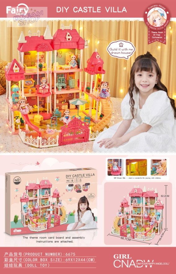 Śliczny, duży, różowy, duży domek z wyposażeniem i laleczkami w zestawie dla dzieci od trzeciego roku życia. W dużym domku znajduje się: sypialnia, salon, sala telewizyjna, pokój do nauki, kuchnia, jadalnia, składzik, są też schody, balkon, zjeżdżalnia, dziedziniec wypoczynkowy i brama. Każde z pomieszczeń jest kompletnie umeblowane, w zestawie mamy też 2 laleczki. Zestaw wykonany został z najlepszej jakości plastiku w żywych kolorach przyciągających wzrok dziecka. Do zestawu dołączono również kartonową podkładkę pod domek. Zestaw zasilany jest bateriami typu 2 x AAA 1,5 V (brak w zestawie). Baterie potrzebne do oświetlenia domu i odtwarzania melodii.