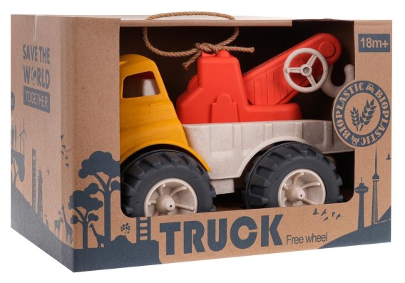 Dźwig wykonany z bioplastiku dla dzieci od 18-go miesiąca życia. Eko-tworzywo jest bezpieczne dla dzieci i przyjazne dla środowiska. Pojazd jest wytrzymały i odporny na uszkodzenia, posiada ruchome elementy. Ręcznie możemy podnosić i opuszczać ramię dźwigu, delikatnie nim poruszać w prawo i w lewo oraz za pomocą korbki wysuwać hak. Dzięki dużym kołom pojazd idealnie sprawdzi się do zabawy na zewnątrz, np. do zabawy w piasku.