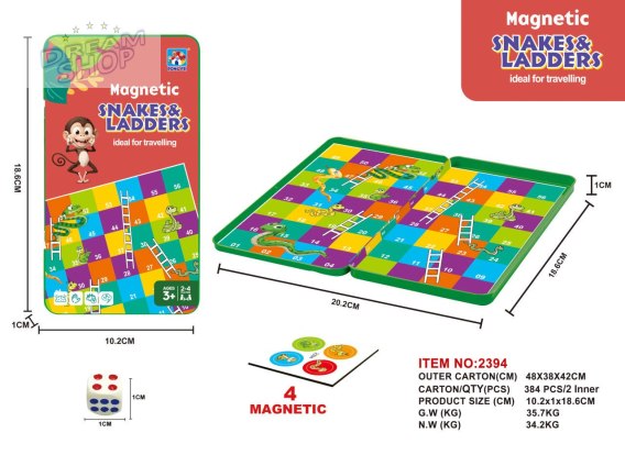 Magnetyczna gra Drabiny i Węże dla dzieci od trzeciego roku życia. Gra jest niewielkich rozmiarów, dzięki czemu można ją zabrać wszędzie ze sobą, pionki są magnetyczne, dobrze trzymają się planszy. W tym zestawie metalowe pudełko gry służy nam za planszę, dzięki czemu gabaryt gry ograniczony jest do minimum.