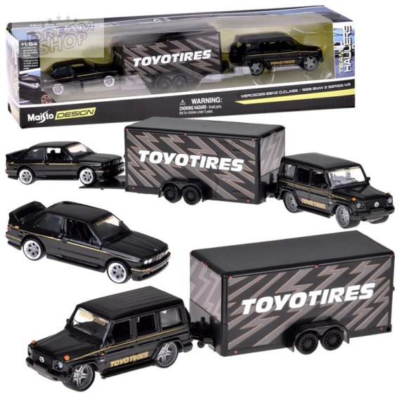 Maisto Licencjonowane auta metalowe 1:64 - Mercedes-Benz G 1988 i BMW M3 E30 z przyczepką