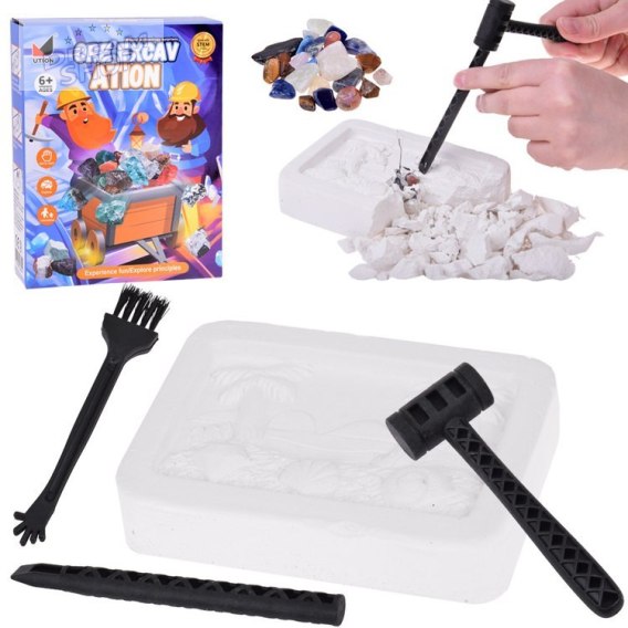 Inspirująca zabawka dla każdego dzieciaka, które w przyszłości chciałoby zostać archeologiem lub poszukiwaczem skarbów. Zabawka w atrakcyjnej formie stanowi symulację wykopalisk i z pewnością zajmie dziecko na dłuższy czas. Zadaniem dziecka jest za pomocą młoteczka i dłuta odnaleźć kolejne zatopione skarby w gipsowym odlewie. Choć zabawa jest pracochłonna, nagradza nas wieloma pięknymi kamieniami, które będą świetną ozdobą każdego dziecięcego pokoju.