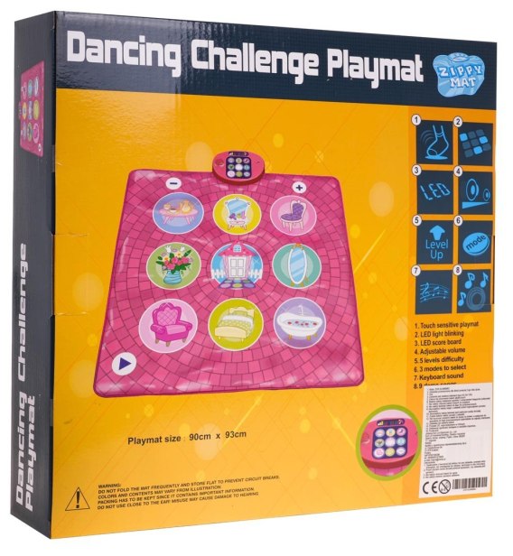 Interaktywna mata muzyczna w wersji dom dla dzieci od 3-go roku życia. Mata wykonana została z bezpiecznych materiałów, najlepszej jakości. Posiada antypoślizgową konstrukcję i jest łatwa w utrzymaniu czystości. Wystarczy przetrzeć ją delikatnie wilgotną ściereczką. Na macie znajduje się 9 obrazków z rysunkami przedmiotów domowych, przyciski dotykowe z minusem i plusem (regulacja głośności), oraz przycisk dotykowy ze strzałką przeznaczony do zmiany poziomu trudności oraz trybów. Mata posiada 5 poziomów, z każdym zwiększa się stopień trudności. Do wyboru mamy 3 tryby zabawy: zabawa taneczna, tryb piano i tryb demonstracyjny z dziewięcioma wbudowanymi utworami. Na górze maty znajduje się panel z podświetlanymi obrazkami rzeczy domowych, tablica wyników LED, głośnik oraz włącznik „on/off". Panel zasilany jest bateriami typu 3 x AA 1,5V (brak w zestawie).