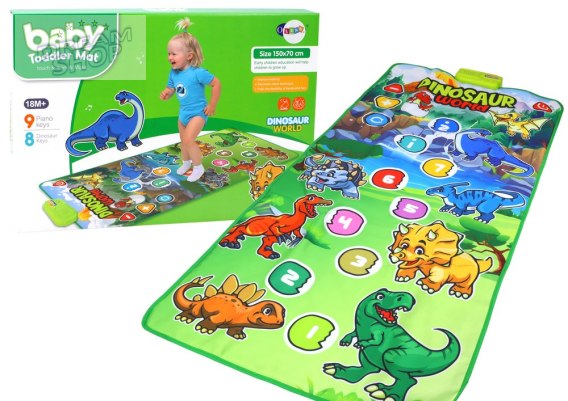 Powierzchnia taneczna maty wyposażona jest w 9 interaktywnych przycisków, które po naciśnięciu uruchamiają różne efekty dźwiękowe i melodie, zachęcając dziecko do aktywności i eksploracji. Natomiast po naciśnięciu w jedno z dinozaurów, dziecko usłyszy odgłosy ryczenia dinozaura.