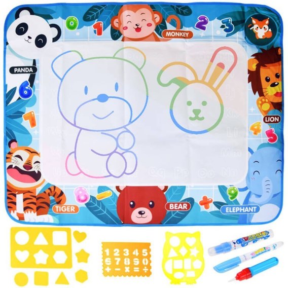 Duża Mata wodna pozwoli każdemu dziecku na tworzenie rysunków, malunków w nieskończoność. Dzięki wodnemu flamastrowi Twoje dziecko będzie mogło rysować, malować do woli!Kolorowa mata wodna w rozmiarze 98 x 78 cm posiada kolorowe tło, które zapewni powstające kolorowe arcydzieło. Obrzeża maty kryją grafikę zwierząt z umieszczonymi ich nazwami w języku angielskim dzięki czemu dziecko będzie mogło przyswajać język angielski podczas zabawy. Zabawa na macie jest totalnie bezpieczna, ponieważ wystarczy nalać do flamastra wodę i zacząć przygodę z rysowaniem, malowaniem, pisaniem. Zestaw został wyposażony dodatkowo w formy do odrysowywania, pędzelek. Z takim zestawem nie ma szans na nudę podczas pochmurnych dni.