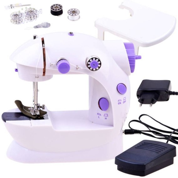 W zestawie: - mini maszyna do szycia - 4 x szpulki z nićmi 3x biała 1 x czarna - 2 x puste szpulki - zapasowa igła - nawlekacz do igły - zasilacz 230V - napęd nożny