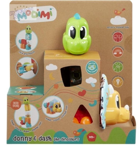 Dinozaury Dony i Dash to niesamowity zestaw dwóch dobranych przyjaciół do zabawy dla najmłodszych! Składa się aż z 12 elementów! Te urocze zwierzaczki zostały stworzone z materiałów w wesołych kolorach, o różnej strukturze i fakturze, dzięki czemu grzechoczą, piszczą i szeleszczą! Moduły z różnych zestawów Modimi można ze sobą łączyć, by dostarczyć dziecku jeszcze więcej doskonałej, kreatywnej zabawy!