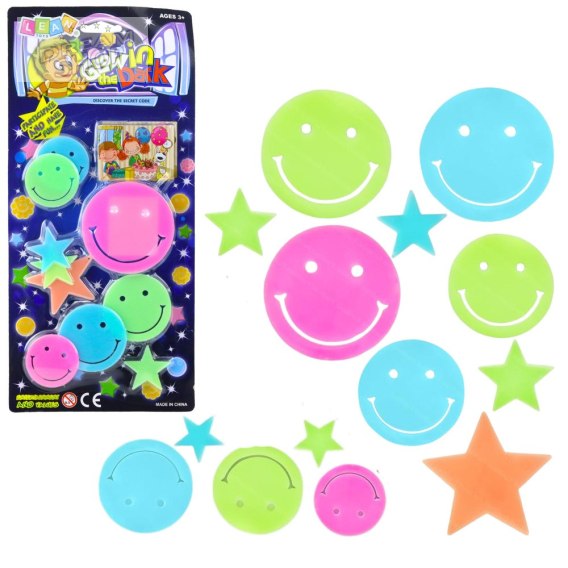 Zestaw fluorescencyjnych naklejek to wesoła i efektowna dekoracja, która wprowadzi do pokoju dziecka pozytywną energię i bajkowy klimat. Komplet składa się z 10 elementów w różnych rozmiarach - kolorowych buziek oraz gwiazdek.