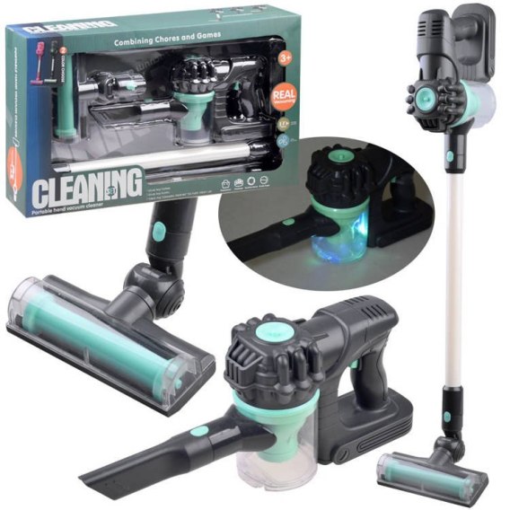 Bezprzewodowy, nowoczesny odkurzacz dla dzieci. Zabawkowy odkurzacz pozwoli na czynne uczestnictwo w codziennych, domowych obowiązkach. Zabawki z tej serii pozwalają dzieciom na uczestniczenie w codziennych czynnościach domowych rodziców w sposób bezpieczny i pełen beztroskiej zabawy. Zestaw ten pomoże w przyuczaniu dziecka do dbania o czystość we własnym pokoju. Zabawa w sprzątanie od najmłodszych lat może okazać się świetnym sposobem nauczenia najmłodszej pociech o dbanie o swój pokój. Zestaw w całości wykonany z plastiku w eleganckim szaro zielonym kolorze. Zabawka posiada dwie wymienne końcówki, podczas pracy świeci kolorowym światełkiem. Kubełek na kurz jest otwierany, dzięki czemu można wysypać zaciągnięte śmieci.