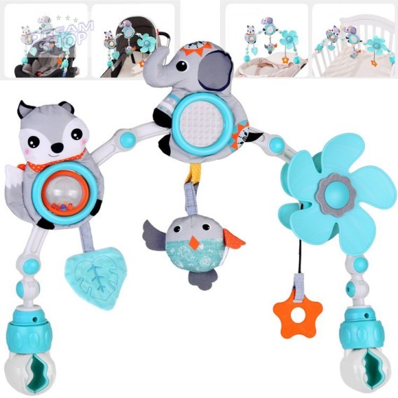 Atrakcje zabawki: - lisek: posiada szeleszczące elementy a wewnątrz grzechotkę, które zachęcają dziecko do łapania, chwytania - słonik z szeleszczącymi elementami i szkiełkiem, - zawieszka ptaszek - atrakcyjny, większy element dla dzidziusiów, - kwiatek - wiatraczek - wystarczy pociągnąć za pomarańczową gwiazdę, by wprawić kwiatka w ruch, - silikonowa gwiazdka jest równocześnie gryzakiem z wypustkami, masującymi obolałe dziąsła - listek - szeleścik